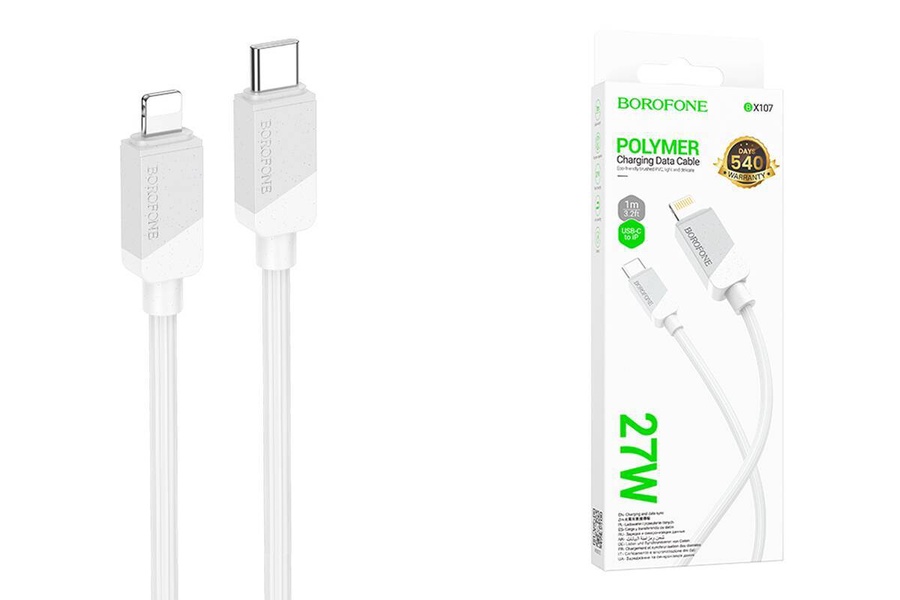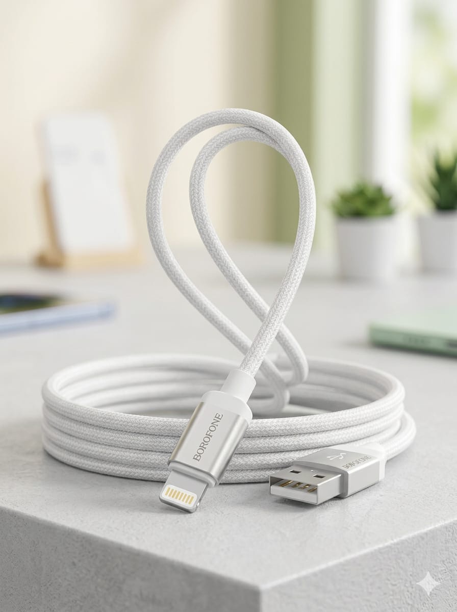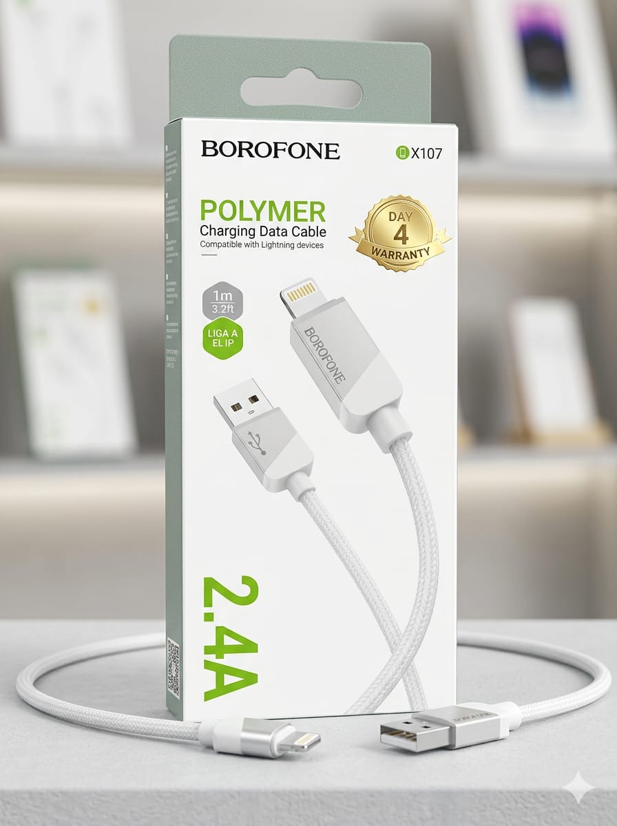 كابل شحن بوروفون BX107 فائق السرعة USB 2.4A لأجهزة آيفون منتج أصلي يتميز بسرعة شحن عالية وجودة ممتازة مصمم خصيصا لأجهزة آيفون يدعم نقل البيانات بكفاءة