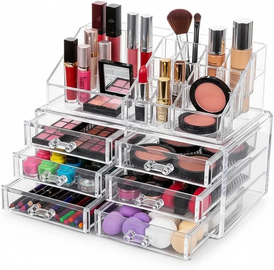 منظم مكياج وإكسسوارات أكريليك شفاف 4 درج مع حامل أحمر شفاه (16 خانة) وجزء علوي مقسم