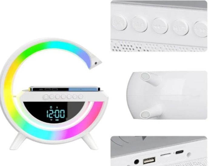 سماعة بلوتوث متعددة الوظائف مع شاحن لاسلكي وساعة رقمية ومنبه مع إضاءة ليلية مميزة