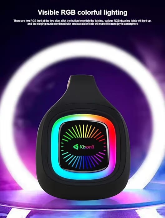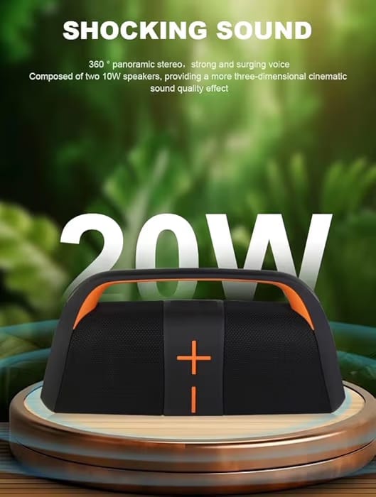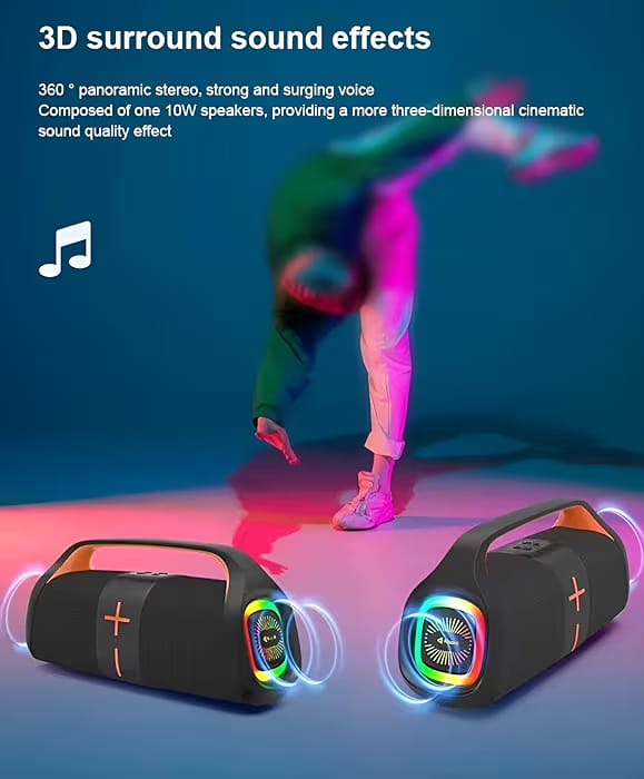 مكبر صوت قوي بقوة 20 واط مع باص عميق وغني يوفر تجربة صوتية استثنائية متصل بالبلوتوث ببطارية تدوم طويلاً 3600 مللي أمبير مقاوم للماء بالكامل مع إضاءة RGB ملونة يدعم التوصيل عبر AUX و TF و USB