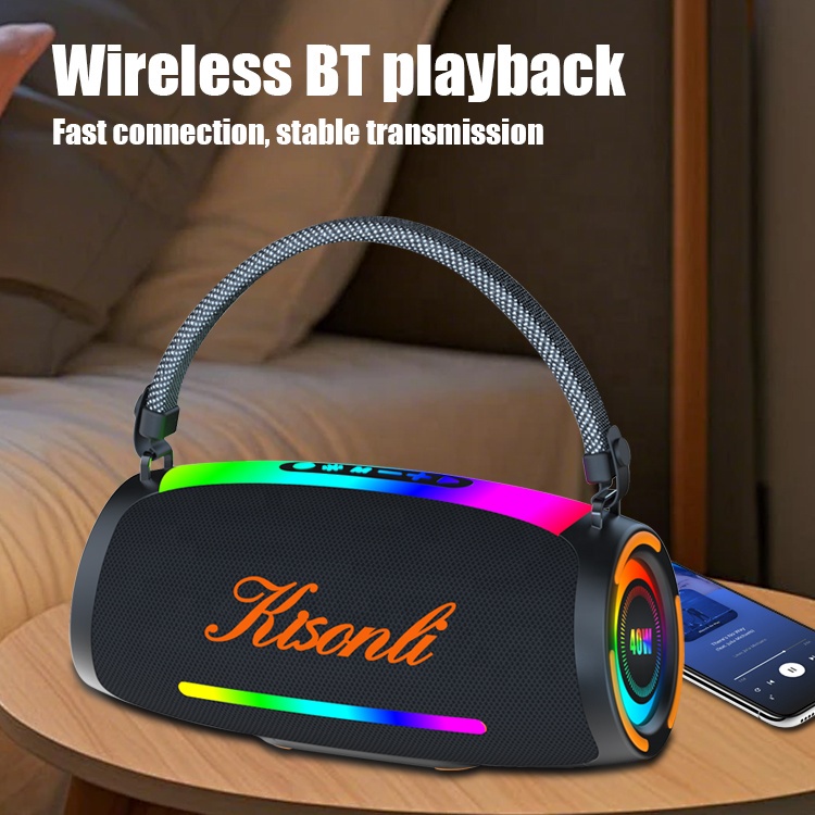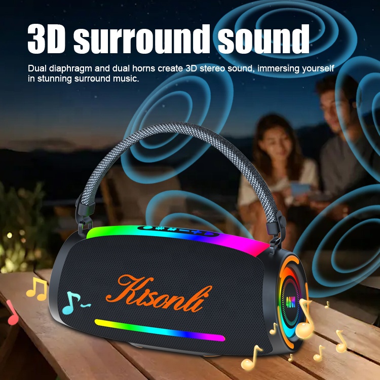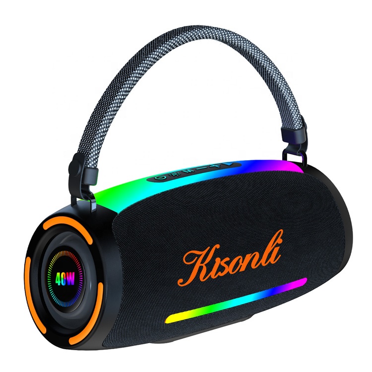 مكبر صوت قوي بقوة 40 واط مع وحدتي صب ووفر لصوت عميق وغني متصل بتقنية البلوتوث ببطارية تدوم طويلاً بسعة 4000 مللي أمبير مقاوم للماء وبه إضاءة RGB ملونة يدعم التوصيل عبر AUX وTF وUSB
