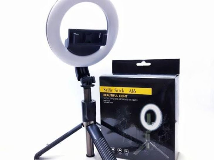 عصا سيلفي رينج لايت بيضاء موديل a16 مع إضاءة دائرية مدمجة لتصوير احترافي مثالي للمحتوى الرقمي والبث المباشر
