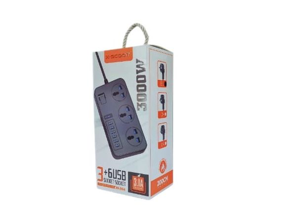 X-SCOOT XS-504 مشترك 3 منافذ بسكويت و6 فتحات USB بقوة 3000 واط. زرار غلق أمان. منتج مميز جدًا.