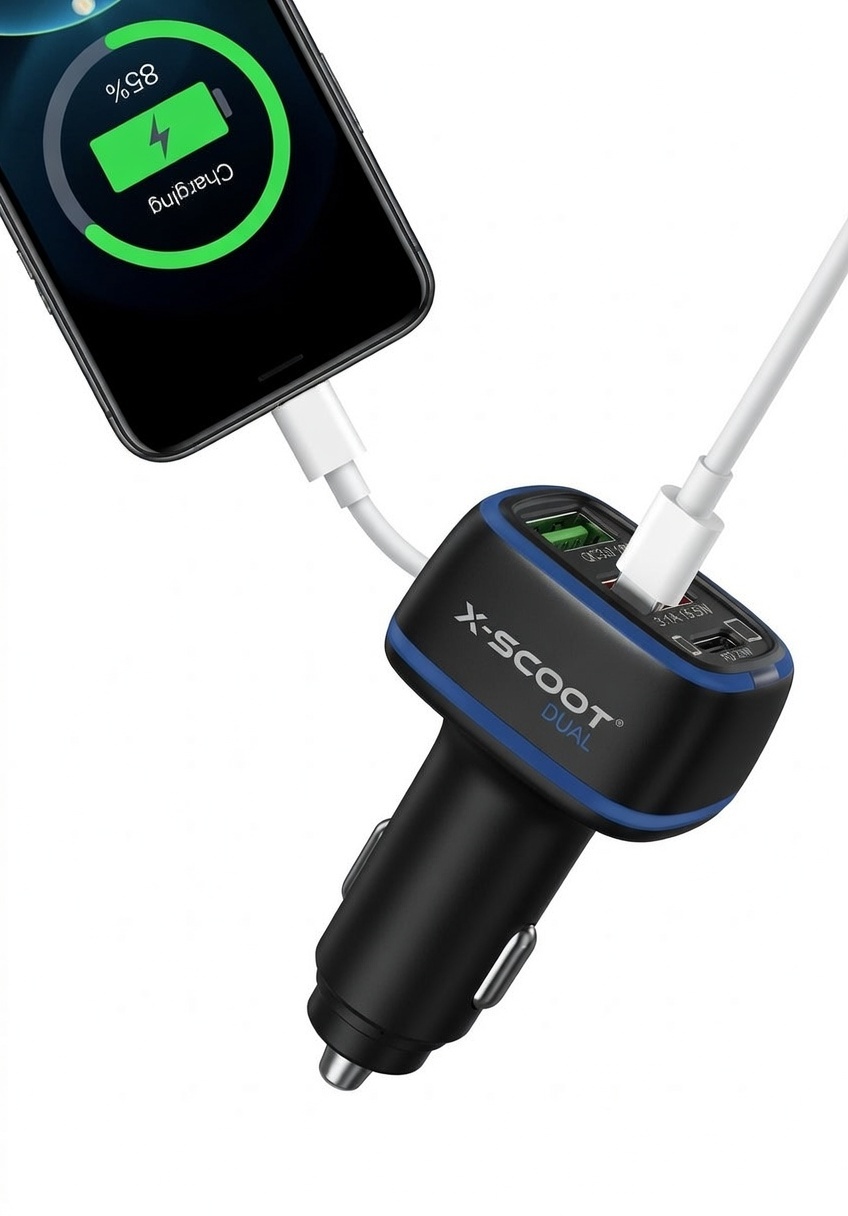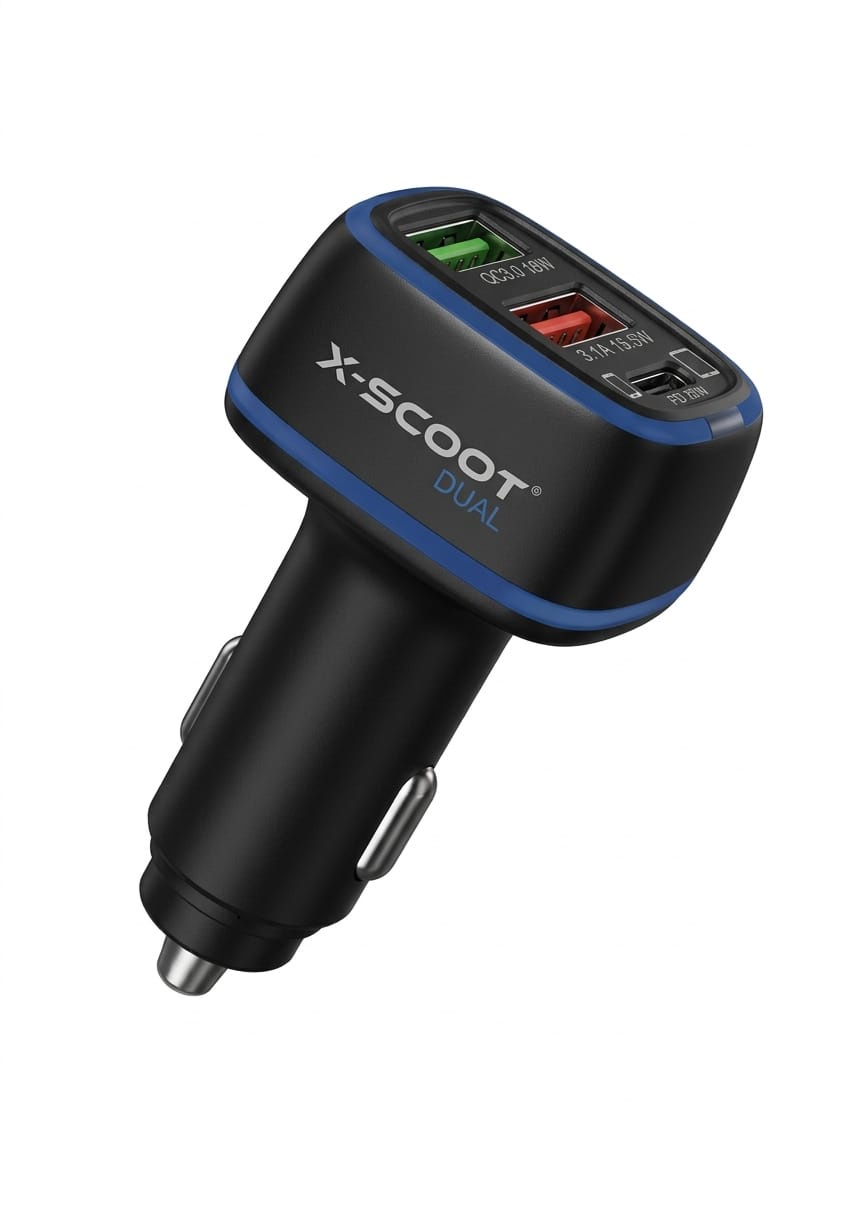 شاحن سيارة اكس سكوت بتقنية كوالكوم ٣ بقوة ٢.٤ امبير مزود بمدخلين يو إس بي ومخرج تايب سي بتقنية بي دي للشحن السريع